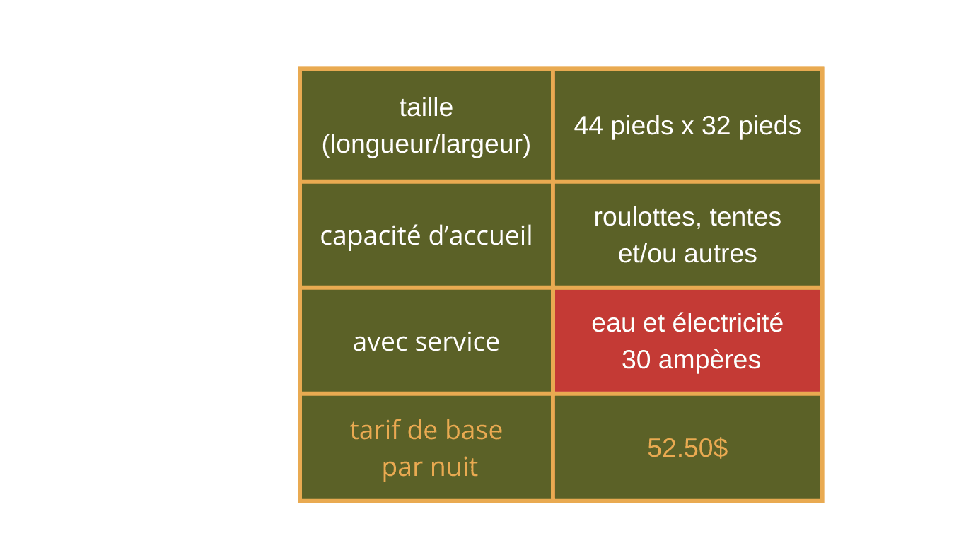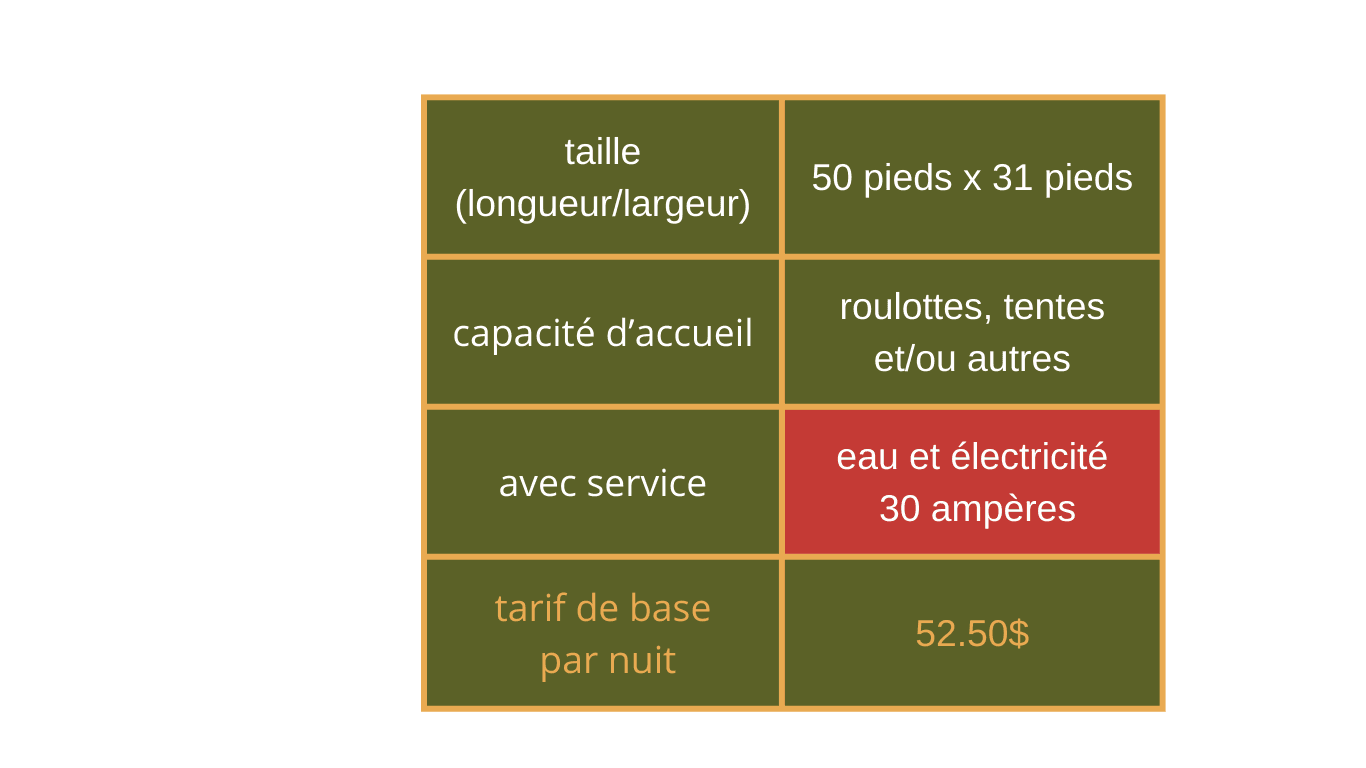 8 terrains de camping sans service près du lac (#1 à 6, 16 et 17) et 4 autres terrains avec deux services sur la colline et avec vue surélevée sur le lac (#11 à 14).